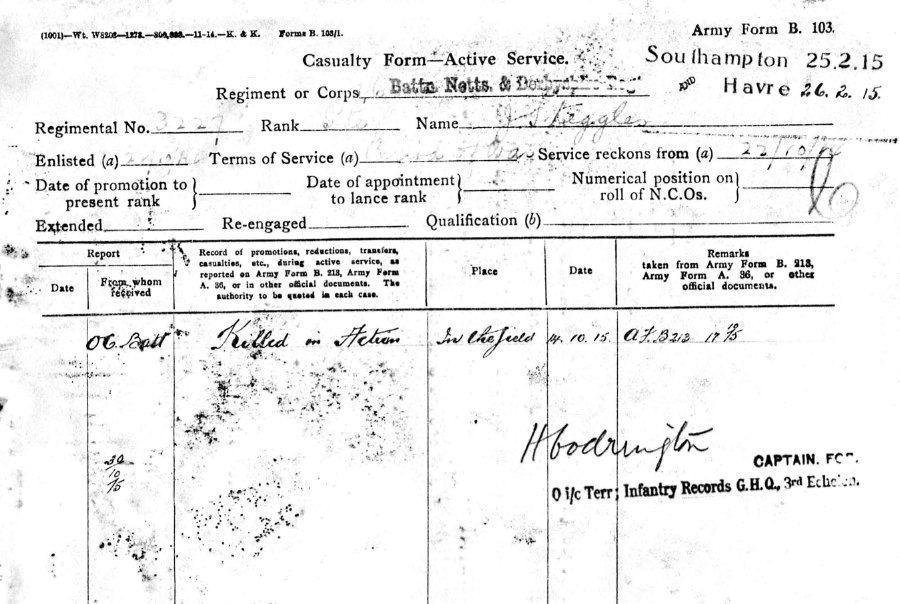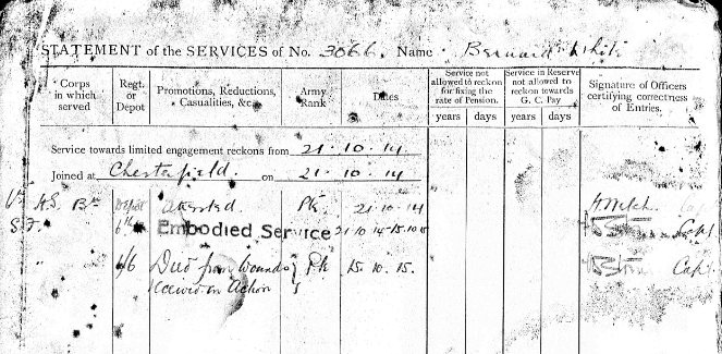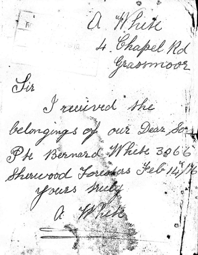 3066 Pte Bernard White aged 20 and the son of Albert and Elizabeth White of 4 Chapel Rd., in Grassmoor near Chesterfield. Buried by the CC at Vermelles I.K.34. Commemorated with Honour on the Grassmoor War Memorial.