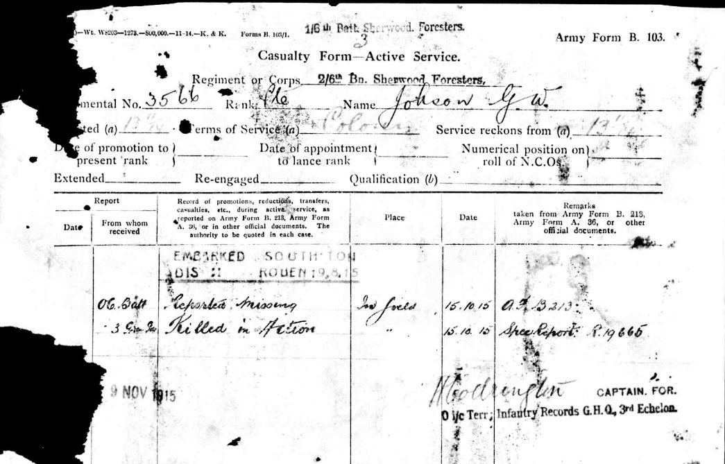 3566 Pte. George William Johnson and the son of Mrs. Annie Johnson of Nutts Yard, Danesmoor, Clay Cross,Derbyshire. Commemorated with Honour on the Danesmoor and Clay Cross War Memorials.