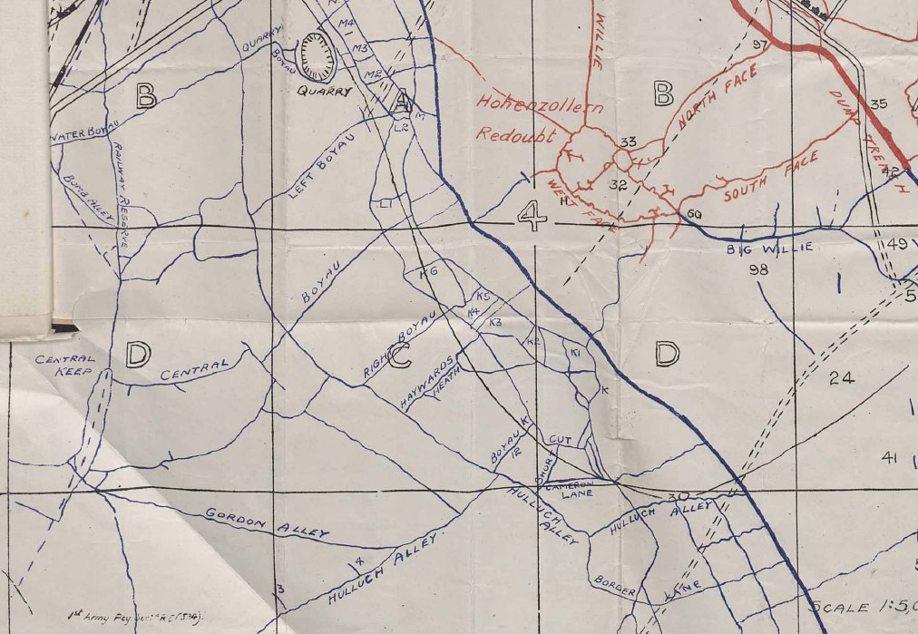 Moving by Companies the Battalion advanced up the main communication trenches, Gordan and Hullach Alley, to the assembly positions in front of the heavily fortified trench system known locally as Hohenzollern Redoubt.