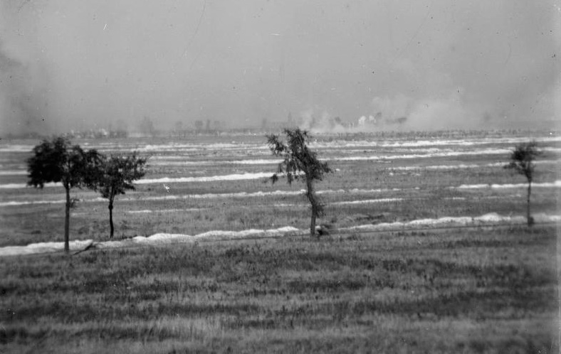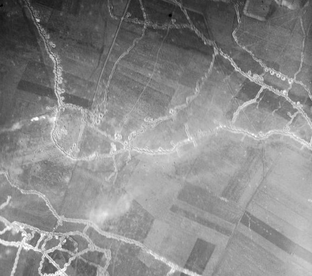 British attack on the Hohenzollern Redoubt, 13th October 1915, by the 46th North Midland Division who captured trenches behind the Vermelles-Hulloch Road and the main trench of the Redoubt. The Photograph shows a cloud of smoke and gas in the centre and on the left; bursting shells in the centre and on the right; British trenches and approaches can be traced by the chalk which has been excavated; Fosse centre; the Redoubt is this side of Fosse 8. Image Courtesy of the Imperial War Museum © IWM (Q 29002).