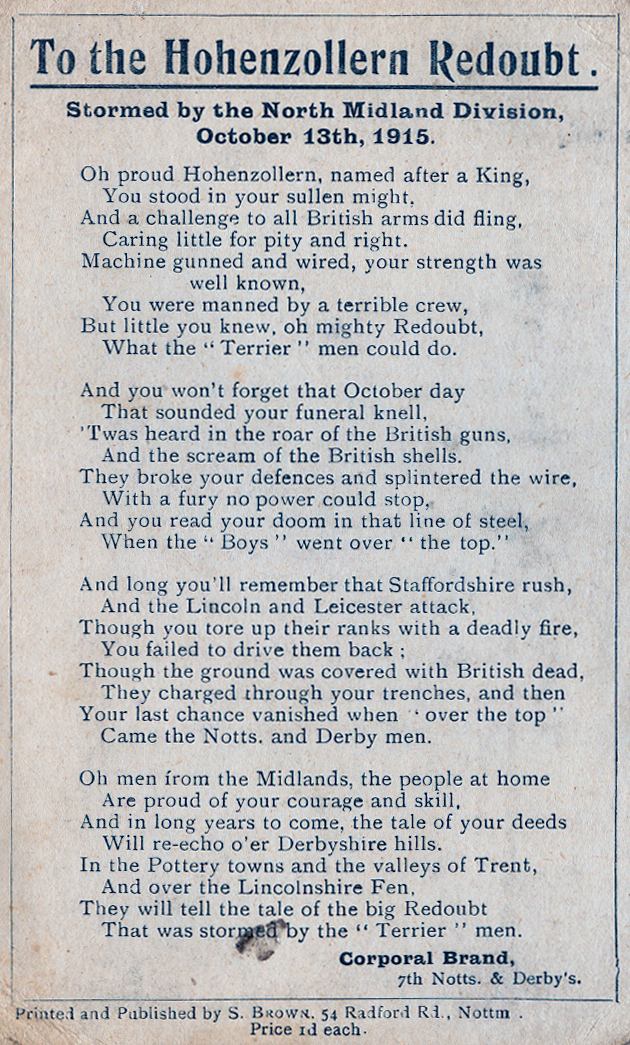 The 6th Sherwood Foresters were placed immediately to the rear of the 137th Brigade, which it was ordered to support in its attack on the area between the western face of the redoubt and the point where ‘Big Willie’ met the le Rutoire-Bethune Road.