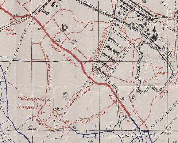 Hohenzollern Redoubt was situated at the apex of a triangle formed by two major trenches; Big Willie and Little Willie, whilst Fosse Trench and Dump Trench formed the base of the triangle in front of the village and colliery. The area to be assaulted was exposed to enfilading machine gun fire from ‘Mad Point’ located at the northwest corner of the redoubt.