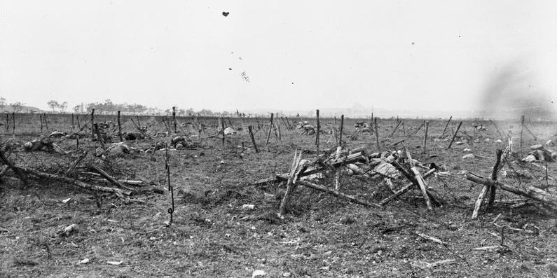 British dead near the barbed wire defences outside a captured German machine gun emplacement near Loos 1915. © IWM (Q 28975).