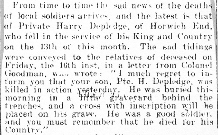 A letter written to the relatives of Harry Depledge by Colonel Goodman records his burial just behind the front line trenches. After the War his grave was lost, like that of six of his comrades, and all of them are now commemorated on special memorials within the grounds of the new cemetery (below).
