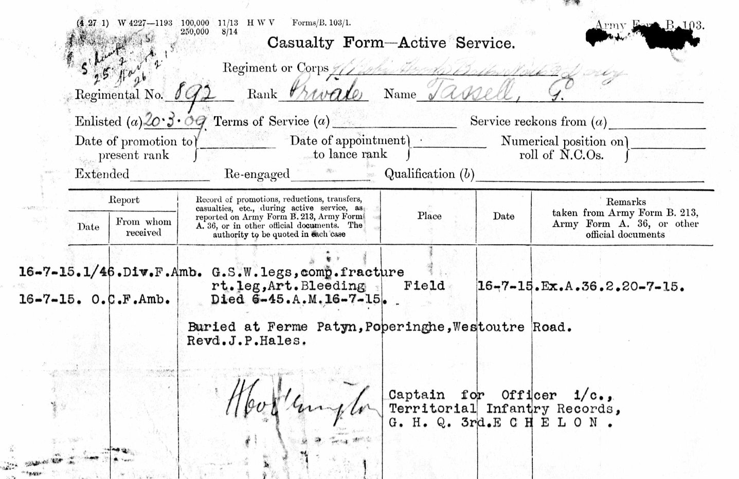 Army Service Record for 892 Private George Tassel of the 1/7th Battalion ‘Robin Hoods’ recording his death at the 1/46th Division Field Ambulance. He was buried at Ferme Patyn on the Westroutre Road by the Reverend J P Hales.