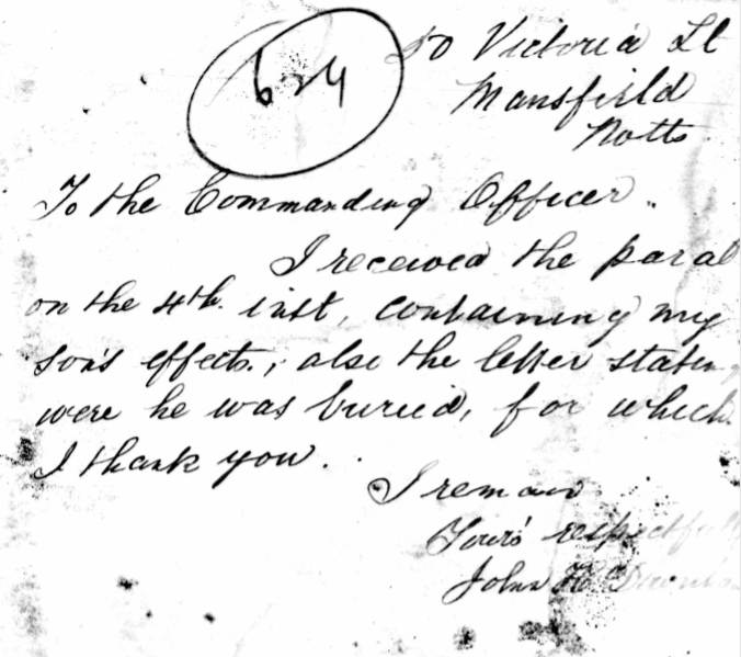 What is also clear from the Army Service Records is that all these men were killed in action ‘in the field’ and that their personal belongings were returned to their next of kin. Indeed, the father of 2739 Reginald Downham of the 1/8th Battalion wrote to the Commanding Officer thanking him for the letter stating where his son was buried. Reginald is now commemorated on Ypres (Menin Gate) Memorial.