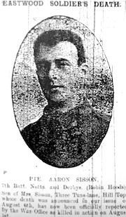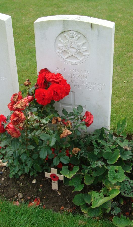 2914 Pte Aaron Sissons was killed in action on 1st August 1915 whilst serving with the 7th (Robin Hoods) Notts and Derby. Like many of his comrades he was buried in a small cemetery just behind the front line and possibly in Sanctuary Wood (which is were his grave is now).