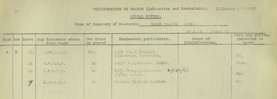 Pte Woolley was buried at I24.b.8.0 and later exhumed in 1919