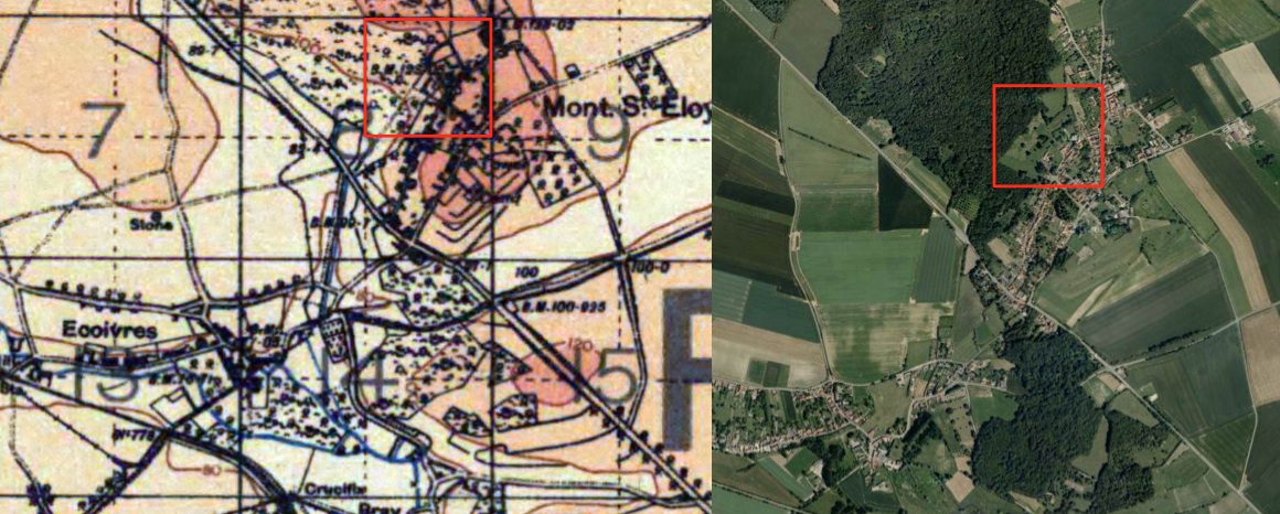 The approximate location of the Cemetery is to the North West of Mont St. Eloi and close to the large wood.
