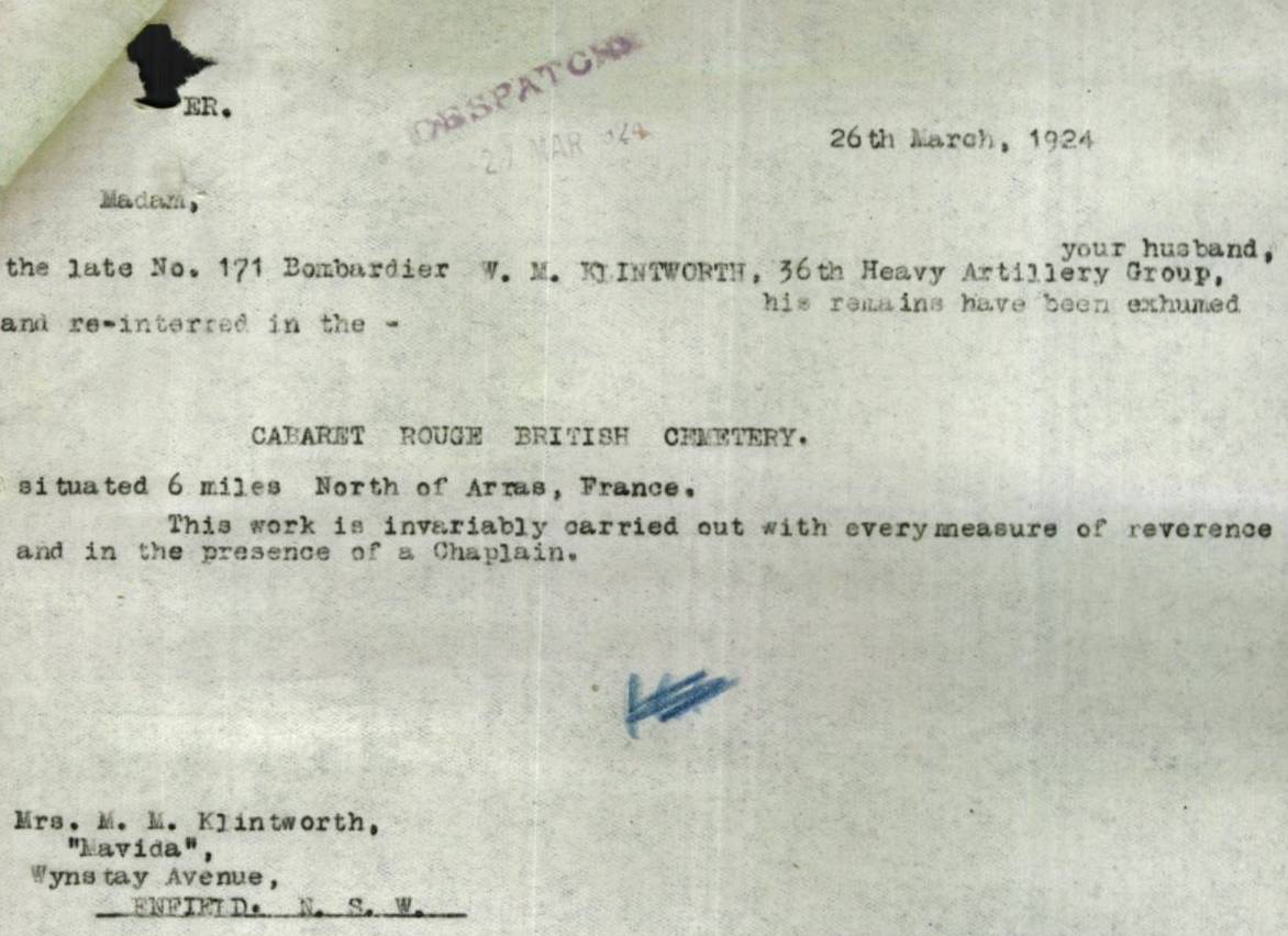 A copy of the letter written to Mrs M Klinworth on the 26th March 1924 informing her that the body of her husband had be re-interred in Cabaret Rouge British Cemetery.