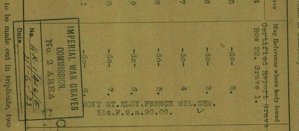 The Commonwealth War Graves Commision have recently released the Burial Returns (Concentration of Graves – Exhumation and Reburials) for Cabaret Rouge British Cemetery and these confirm the location of Mont St. Eloy French Military Cemetery as 51. C. F. 2. A. 90. 00.
