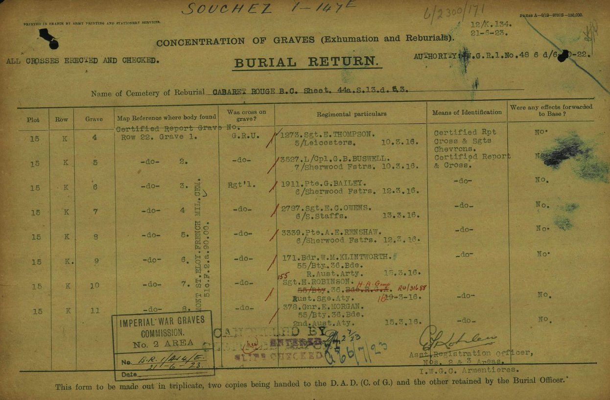 Graves Registration Report dated 18th August 1925 recording the burial of men in Plot 15 Row “K”. Lying alongside the North Midlanders are men Gunners from the 36th Brigade of the Australian Siege Artillery and the 317th Brigade of the Royal Field Artillery.