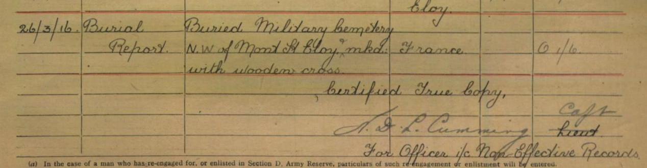 Army Form B. 103 “Casualty Form – Active Service” for George Taylor is the only one to record the original burial in Mount St. Eloi that was preceded over by Reverend John P Hales.