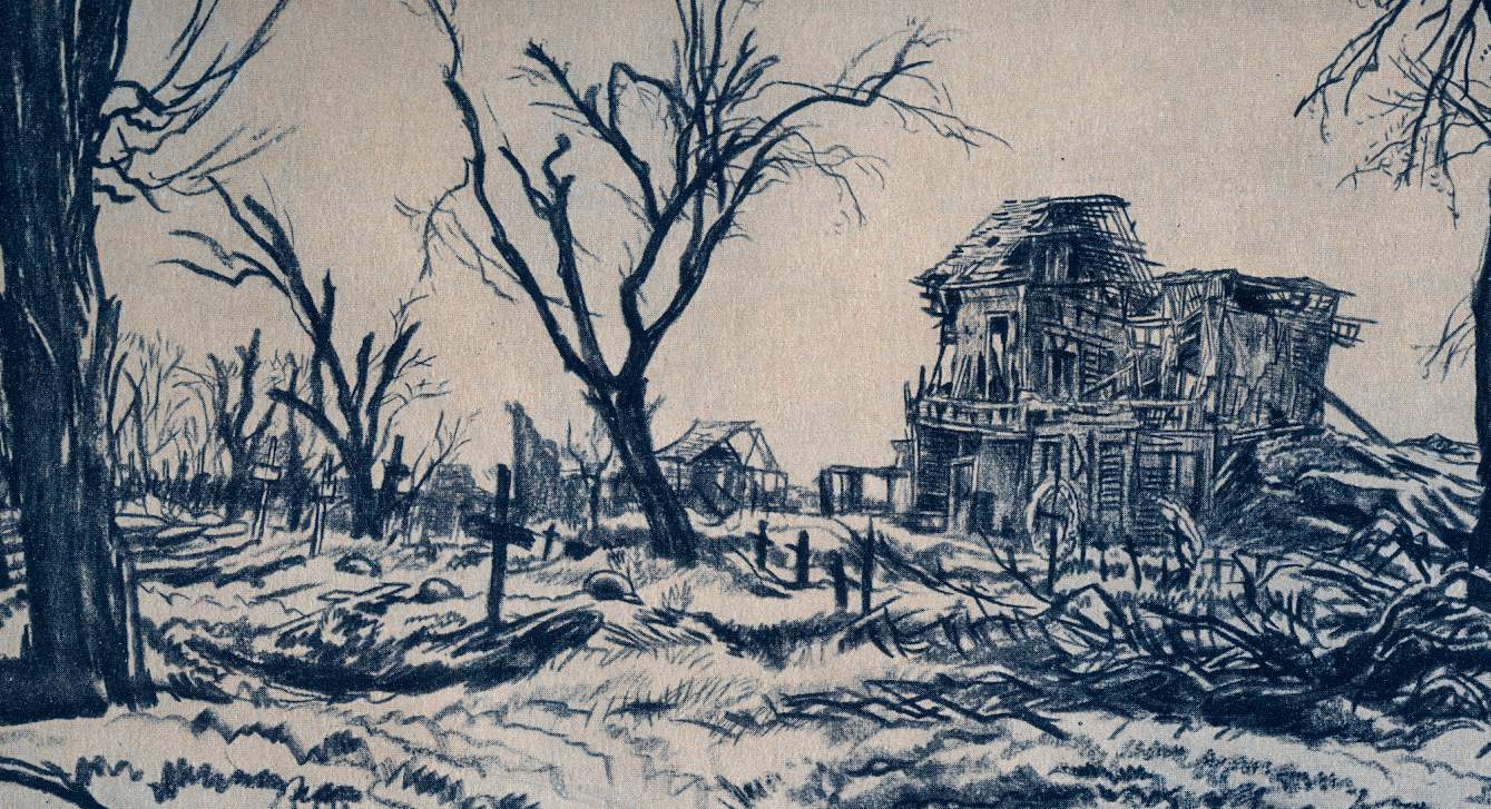 A young British infantryman in full kit lying asleep on the ground. He rests his head on his hands, his steel helmet on the ground near his head. Ruins can be seen on Mont St Eloi in the left background, with the high ground of Vimy Ridge just visible on the horizon. Image Courtesy of the Imperial War Museum © IWM (Art.IWM ART 2990).