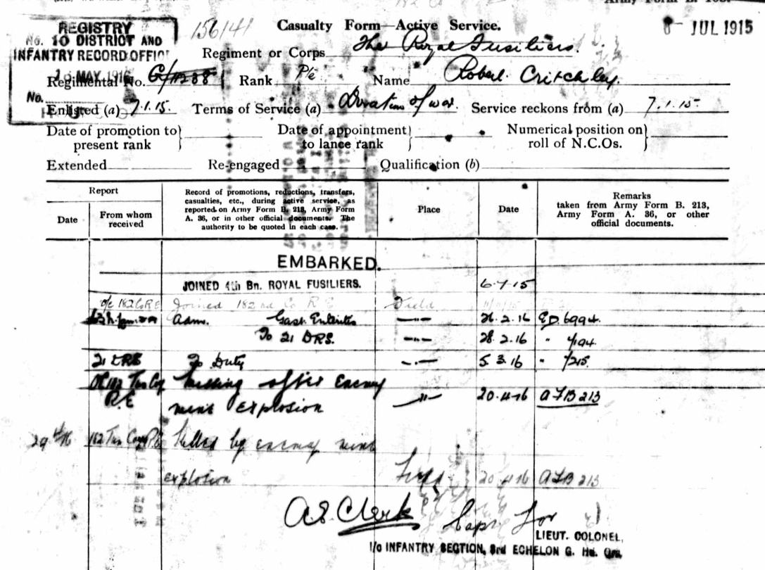 Casualty Form – Active Service for G/11288 Robert Critchley of the Royal Fusiliers showing his attachment to the 182nd Tunnelling Company in November 1915 and his death due to a German mine explosion on 20th April 1916.