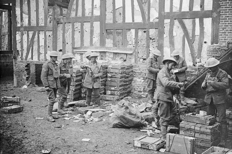 Men of the 8th Battalion, Nottinghamshire and Derbyshire Regiment (Sherwood Foresters) fixing fuses in stokes mortar bombs. Fonquevillers, March 1917. Imperial War Museum © IWM (Q 4918).