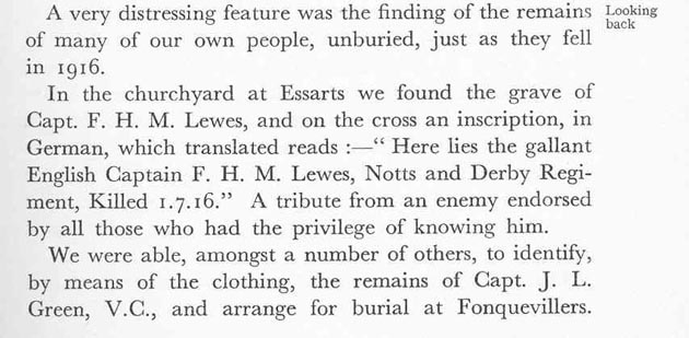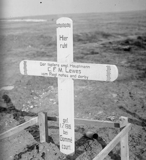 The grave of Captain Frederick Henry Meredith Lewes, Adjutant of 1/5th Battalion, Nottinghamshire and Derbyshire Regiment erected by the Germans at Gommecourt, where he was killed on 1st July 1916. Photograph taken in March 1917. Courtesy of Imperial War Museum © IWM (Q 7797).