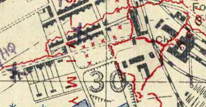 • 10 Platoon went through a gap in wire at M.30.a.85.20. and along road towards north end of FOSSE. Fired on heavily by machine guns from buildings at east end of road, which were 20 to 30 feet above the level of the road. Came to wall 5′ high. Lieut Brown went over and was killed as he did so. Some men who followed found an uncut belt of wire just over the wall. They lay in shell holes till dark. Remainder of Platoon forced to withdraw to old enemy gun pits about M.30.d.80.15. till dark. 1 man of 266 Regiment (killed when trying to escape) set fire to house at M.30.a.72.12. as soon as our men advanced. Resulting flames showed up everyone plainly. Man must have been hidden in house since previous evening. Enemy must have re-occupied houses at east end of 1 & 2 BIG ROW SOUTH at ZERO. Much sniping and machine gun fire from these points.10 Platoon