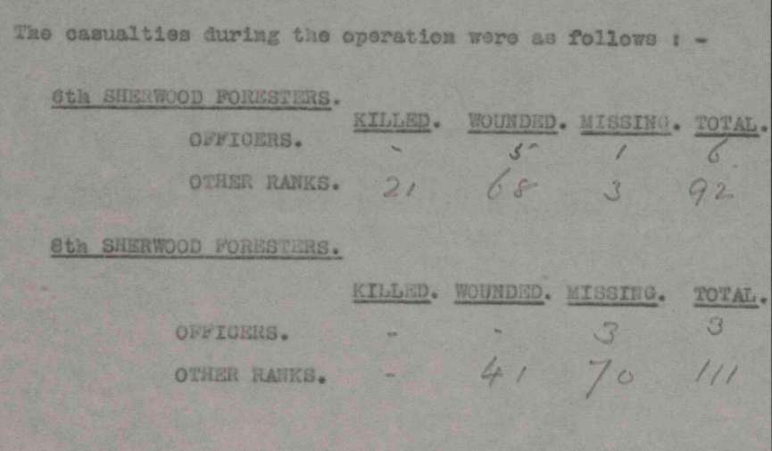 139th Brigade recored that the 1/6th Sherwood Foresters suffered a total of 98 casualties