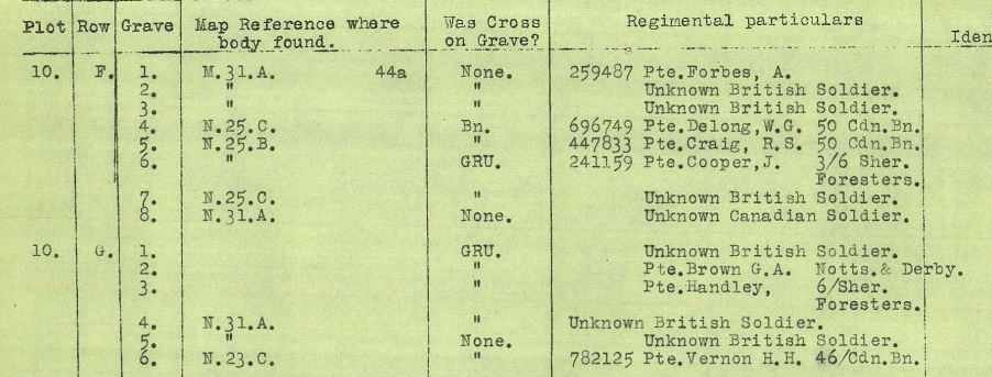 • The bodies of Lieutenant Cecil Arthur Brown, 7693/242490 Pte John William Jones and 1754/240246 Pte William Jodrell were discovered at N.25.c.