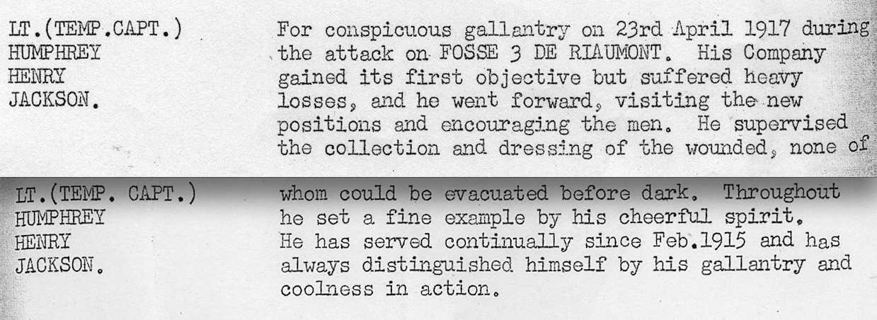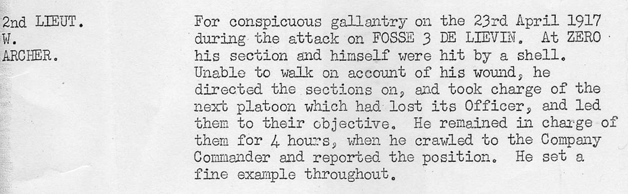 Robinson VO June 1917Armitage VH June 1917Rowland MC April 1917Brown CA April 1917Jackson HH April 1917Archer April 1917Longson DCM June 1917240827 Bedford April 1917240853 Hadfield April 1917241360 Evans April 1917