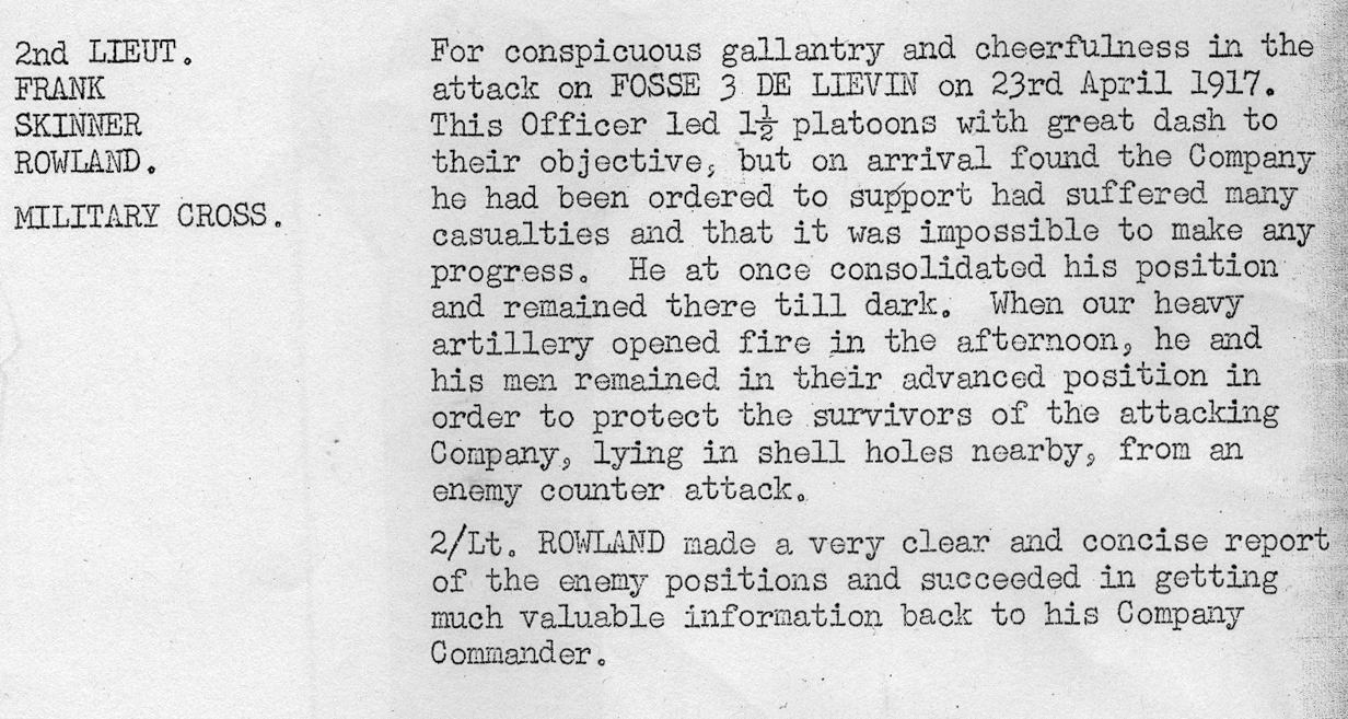 I am researching the wartime experiences of Captain Frank Skinner Rowland MC for Rudgwick Preservation Society. His daughter lives in the village in West Sussex. I have a photograph of him and photographs of his MC and other artefacts. i feel sure his daughter will want to share what she has and what she knows if we can correspond. I hope you can fill me in on further details too.