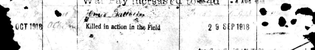 Just before the Battalion were due to withdraw from Montbrehain to the reserve area, Lieutenant Percy Alexander Tompkinson (WO/374/69099), a teacher from Longton near Stoke-on-Trent, was killed. There is no record of how he died, but his body was later buried in the small cemetary that had been started next to the crucifix near to the village cemetary.