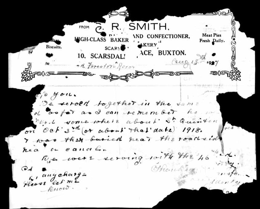 Further confirmation that men of the 46th Division were buried close to the canal at Bellinglise comes in the form of a letter held within the service record of 2292 Pte. James Grice, which states “he [Grice] was then buried near the roadside near a canal”.