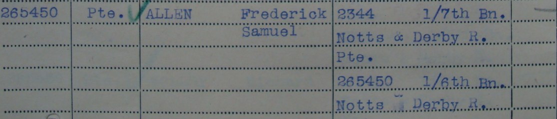 - Pte. 2344/265450 Frederick Samuel Allen aged 29 and the son of George and Harriett Allen of Clifton in Nottingham. A pre-War Territorial who arrived in France in February 1915. Later transferred to the 1/6th Battalion.
