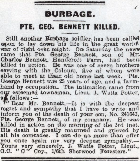 - Pte. 4691/241643 George Bennett and from Buxton. Attested in the Derby Scheme in January 1916. Arrived in France with 2/6th Battalion in 1917. Later transferred to 1/6th Battalion and killed at H.10.d.2.4.