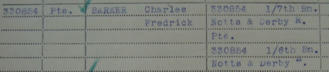 - Pte. 330854 Charles Frederick Barker aged 21 and from Long Eaton. Served with the 21st Battalion and transferred from the 1/7th Battalion. Commemorated on the VIS-EN-ARTOIS MEMORIAL to the missing.