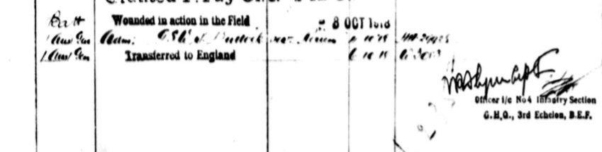 - 166/240017 Qmstr.- William Barker suffered a GSW in the foot and thigh and transferred to England. Enlisted in April 1908 and arrived in France with the 46th Division in February 1915.