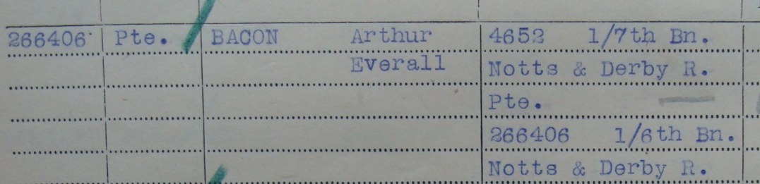 4652/266406 Pte. Arthur Everall Bacon from Bulwell in Nottinghamshire is the only Sherwood Forester to be buried in this Cemetery and he was most likely killed during the 1/6th attack on the Beaurevoir-Fonsomme Line. Arthur originally enlisted into the 1/7th Battalion towards the end of 1916 and may have been a Derby Scheme man. He may have been transferred to the 1/6th Battalion when the 1/7th Battalion was ‘reduced in establishment to a Training Cadre’ and 22 Officers and 620 other ranks were transferred to “K” Infantry Base Depot.