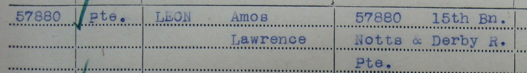 - Pte. 57880 Amos Lawrence Leon aged 33 and the son of W and E Leon of Saxmundham; husband of Mary Leon of Harby, Melton Mowbray in Leicestershire. The Medal Roll only records that Amos served with the 15th Battalion.