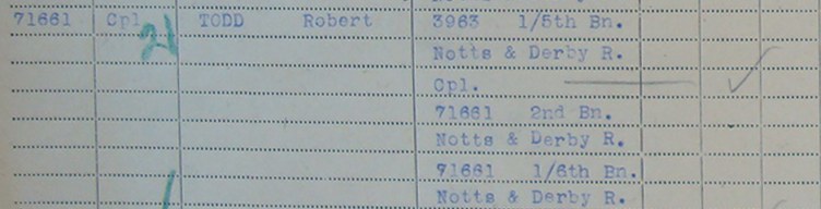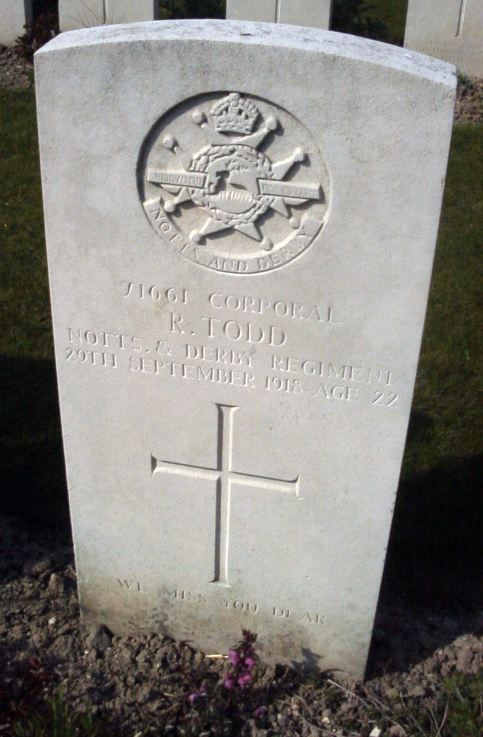- Cpl 3963/71661 Robert Todd aged 22 from Derby. Arrived in France with the 1/5th Battalion in November 1915 and also served with the 2nd Battalion. Buried in Bellicourt British Cemetery.