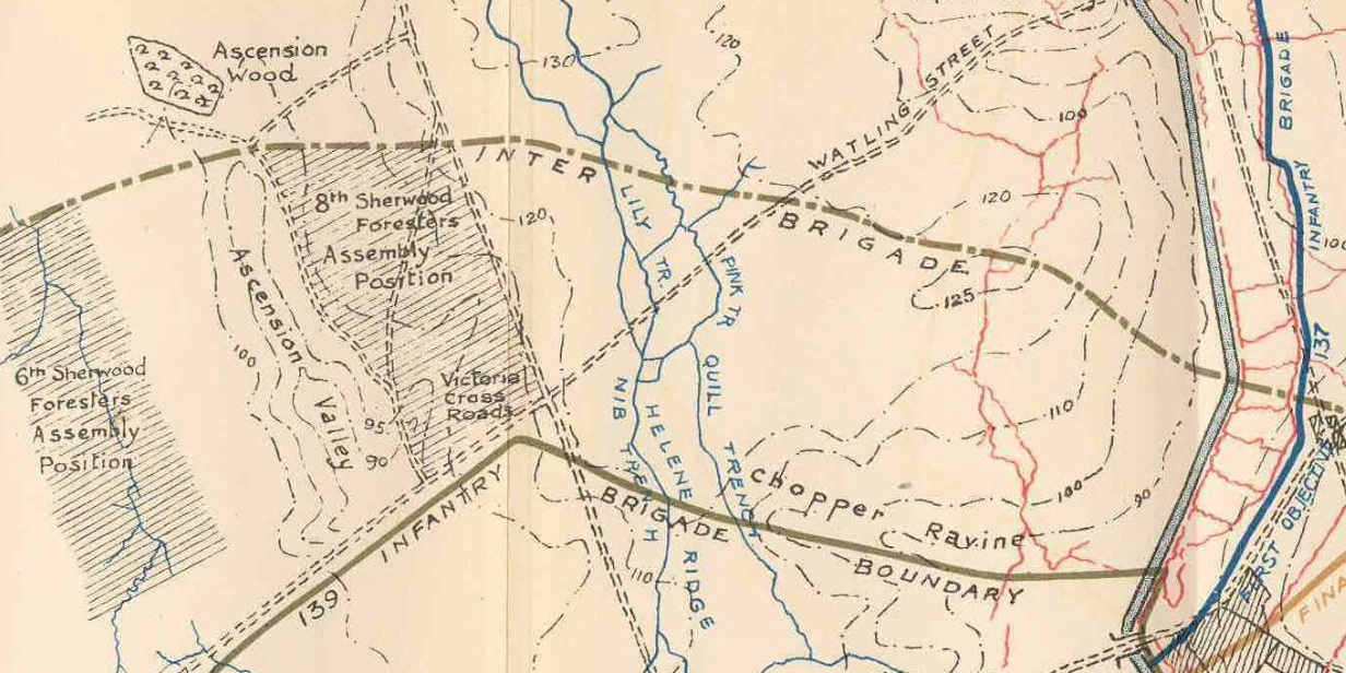 The two Companies on the right flank (“A” and “C”) found the 8th Sherwood Foresters around the BROWN LINE and advanced with them helping to take the YELLOW LINE; clearing out dugouts on the way.