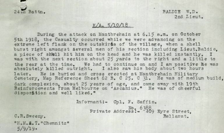 “…. the casualty occurred while we were advancing on the extreme left flank on the outskirts of the village, when a shell burst right amongst several men of his section including Lieut. Baldie, a piece of shell hit him on the head and he was killed instantly….He was buried with the others of the 24th Battn….Adolphsen of the same Coy buried him and five other, about 100 yards from where he was killed. Thorncross (A.16), Weeller (A.20) and Missen (A.17) were amongst those buried with him….. a cross was made from Fritz Ammuniation Boxes, with his name inscribed on it and placed were he was buried.”