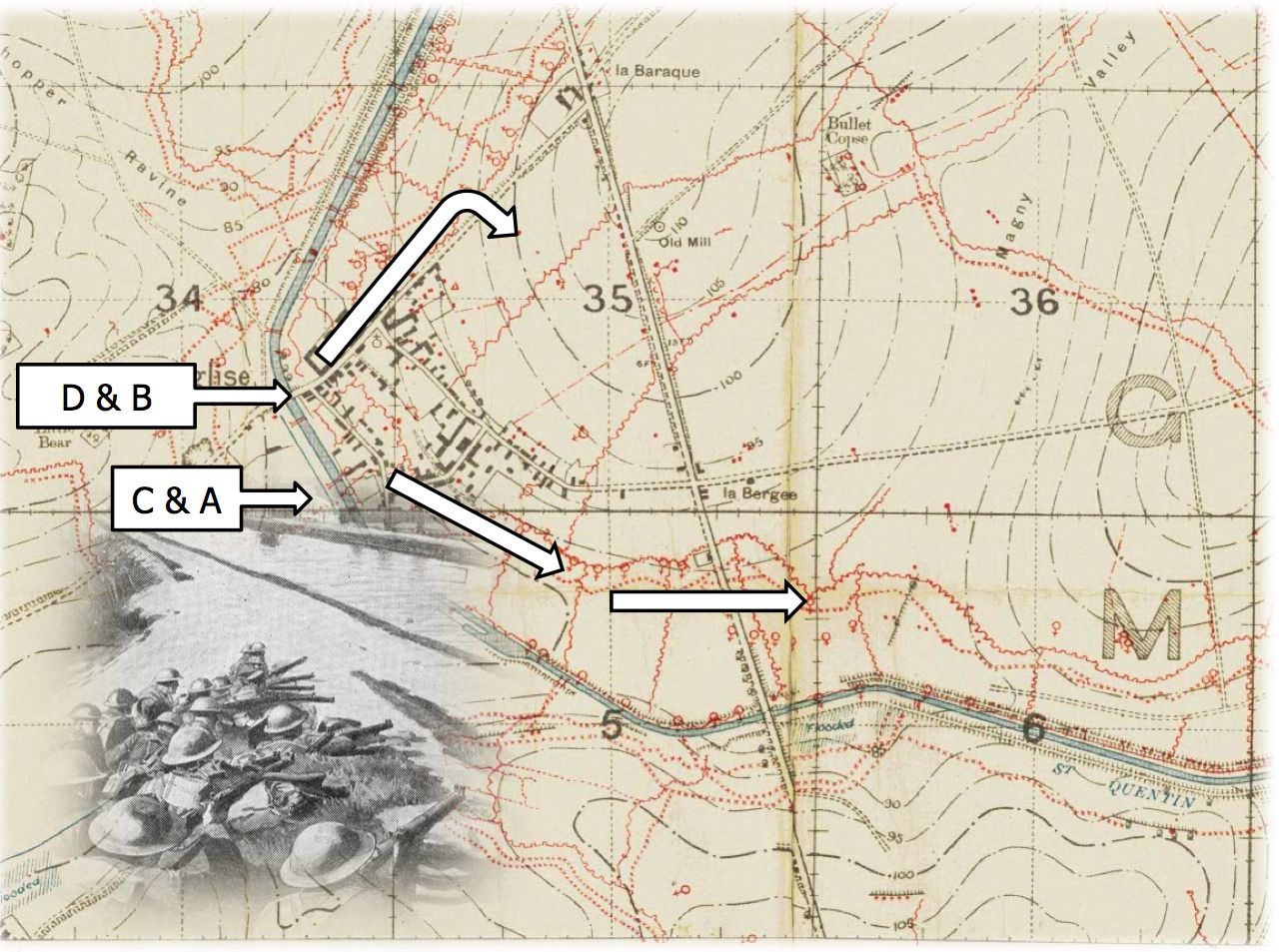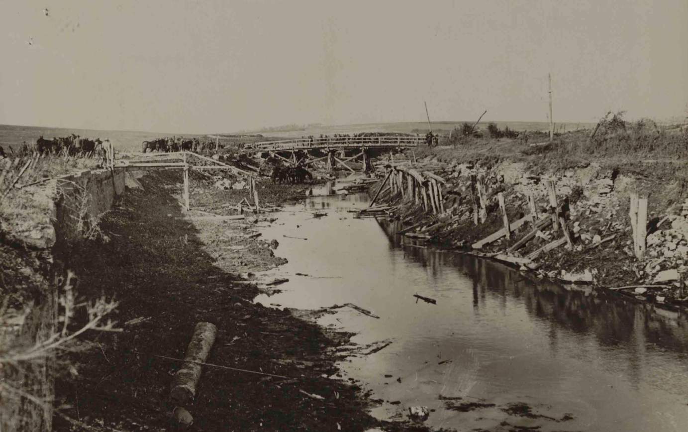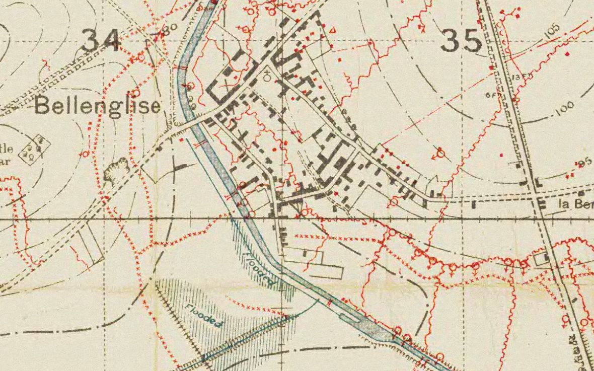 “B” Company on the left flank crossed by a broken wooden bridge, whilst the reminder of the Battalion crssed over the main bridge to the north of Bellenglise.