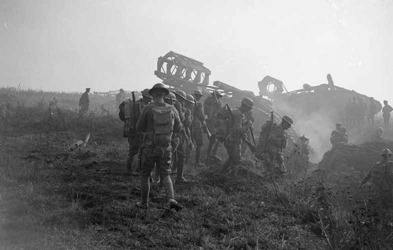 Attack on the Hindenburg Line. Tanks and Troops going forward near Bellicourt on 29th September 1918. Imperial War Museum © IWM (Q 9371).