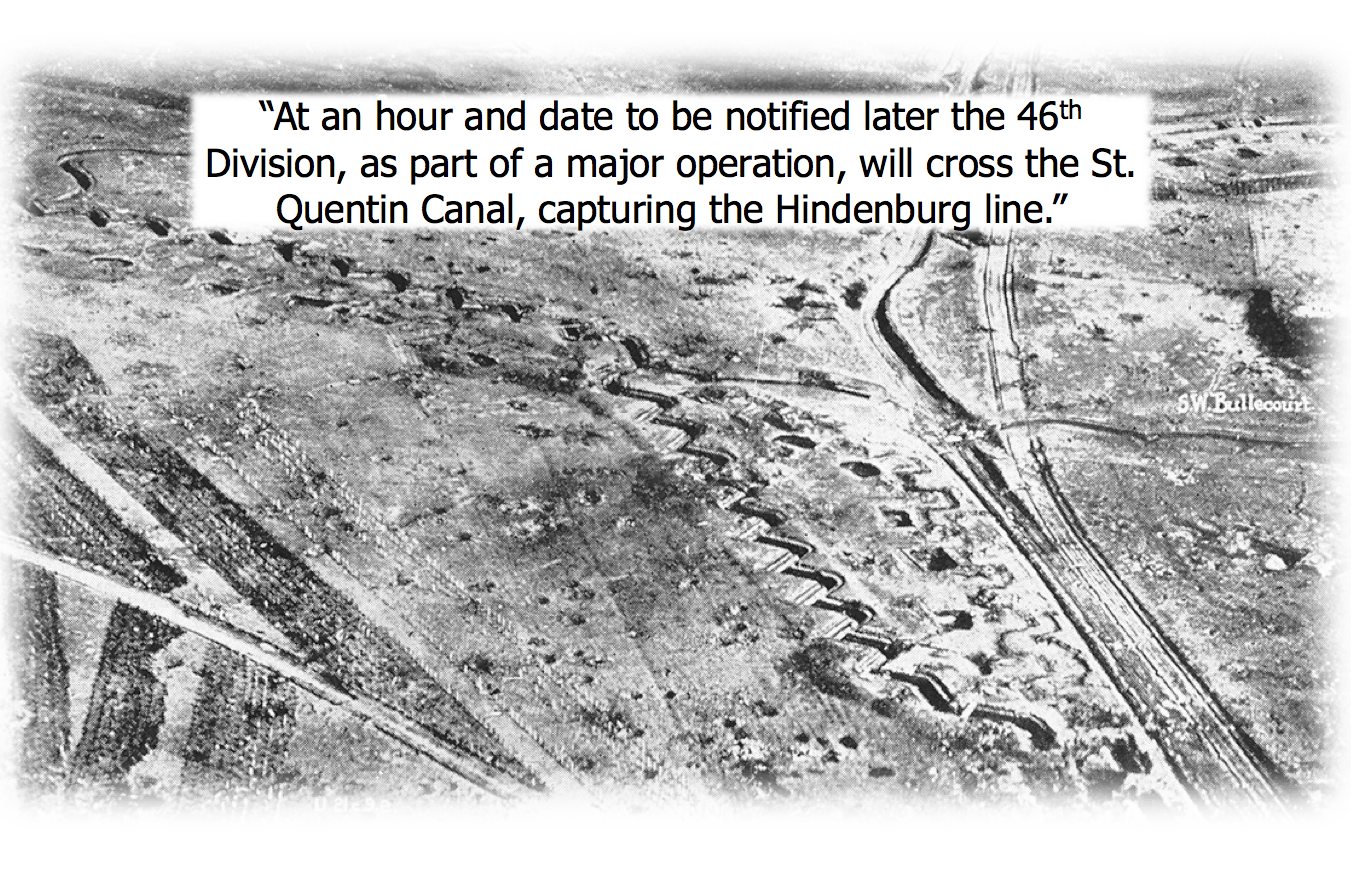 “At an hour and date to be notified later the 46th Division, as part of a major operation, will cross the ST. Quentin Canal, capturing the Hindenburg line”