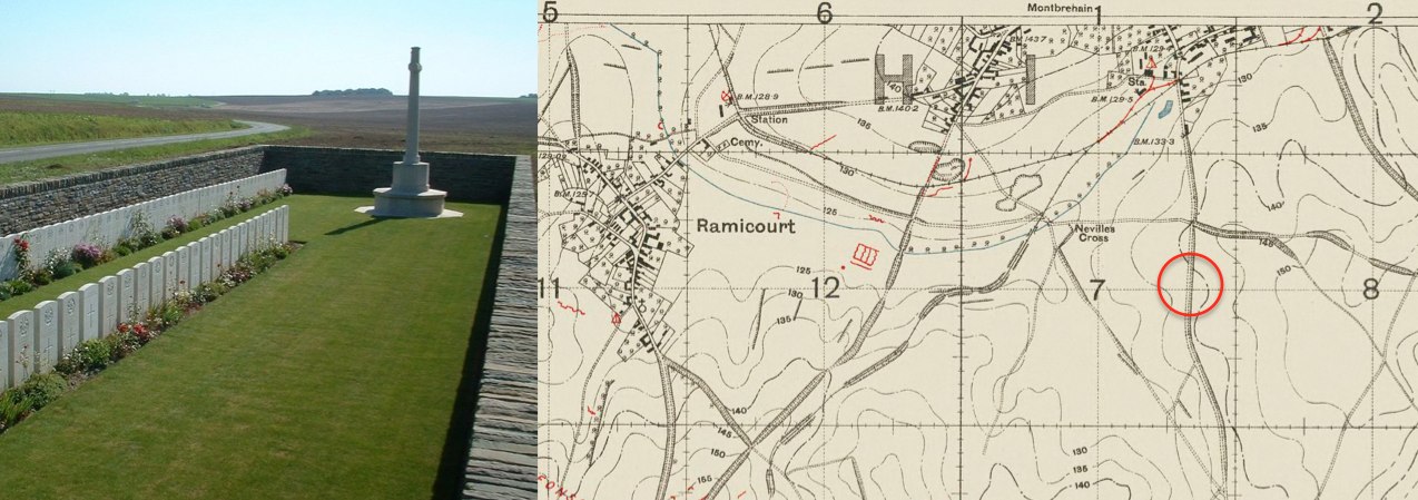 These men are buried in several Cemeteries in the area around Bellinglise; some of the men are still interned in the ground that they were originally buried, whereas the bodies of other men were exhumed and moved to concentration cemeteries after the War.