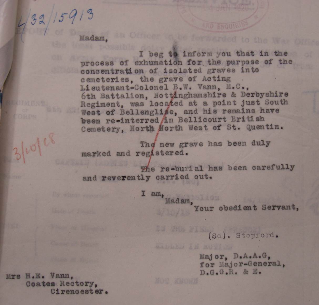 Letter written to Mrs Vann in January 1920 informing her that the Grave Registration Department had located the grave of her husband and had re-interred it in Bellicourt British Cemetery.