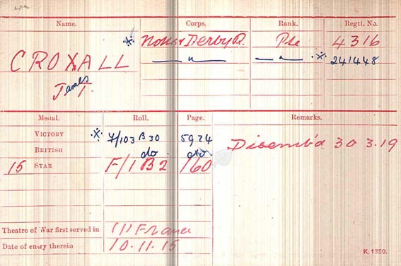 4316 Pte James Croxhall. Enlisted in June 1915 and arrived in France 10th November 1915.