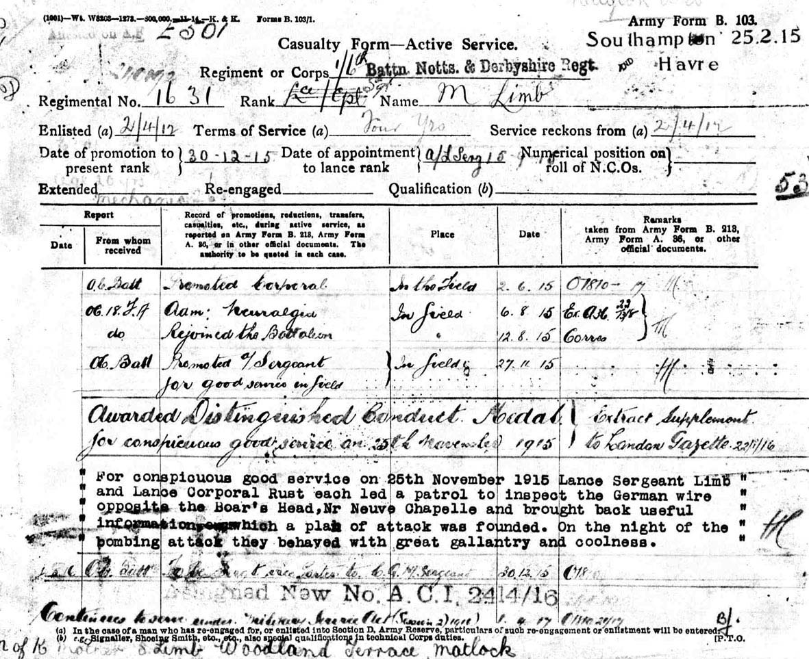 1631 L/Sergt M. Limb. A mechanic from Matlock Bath he enlisted in April 1912 and arrived in France in February 1915. He was disembodied on 18th March 1919.