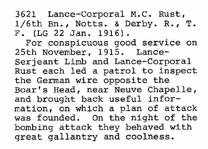 No. 3621 L/Cpl. M.C. Rust. A draughtsman from Chelmsford he enlisted in December 1914 and arrived in France on 28 February 1915. Later Commissioned 2/Lt 24.1.17 in Essex Regt.