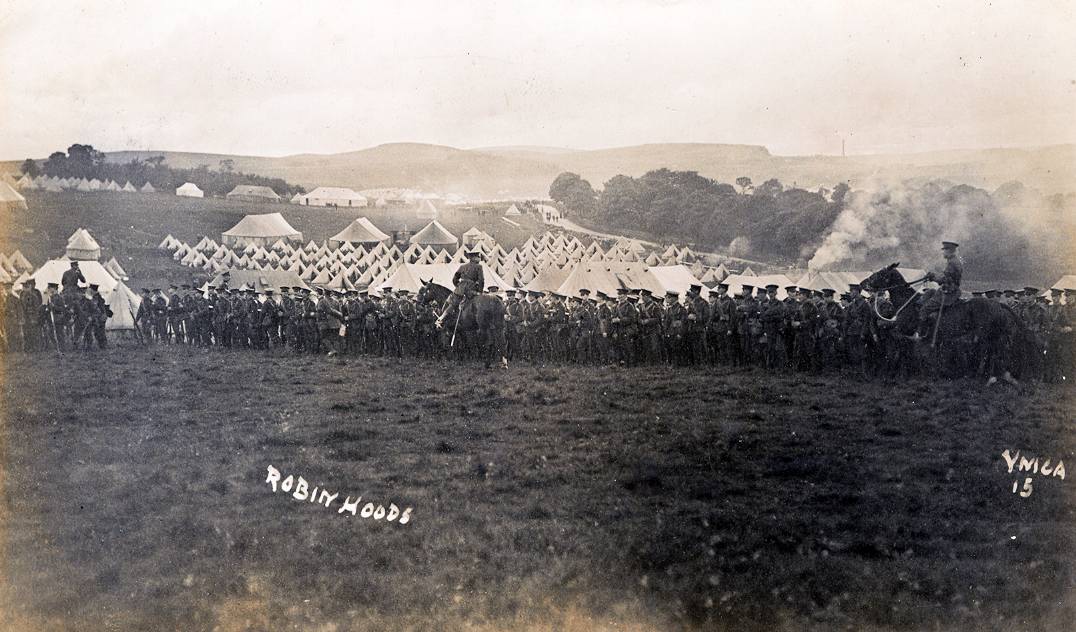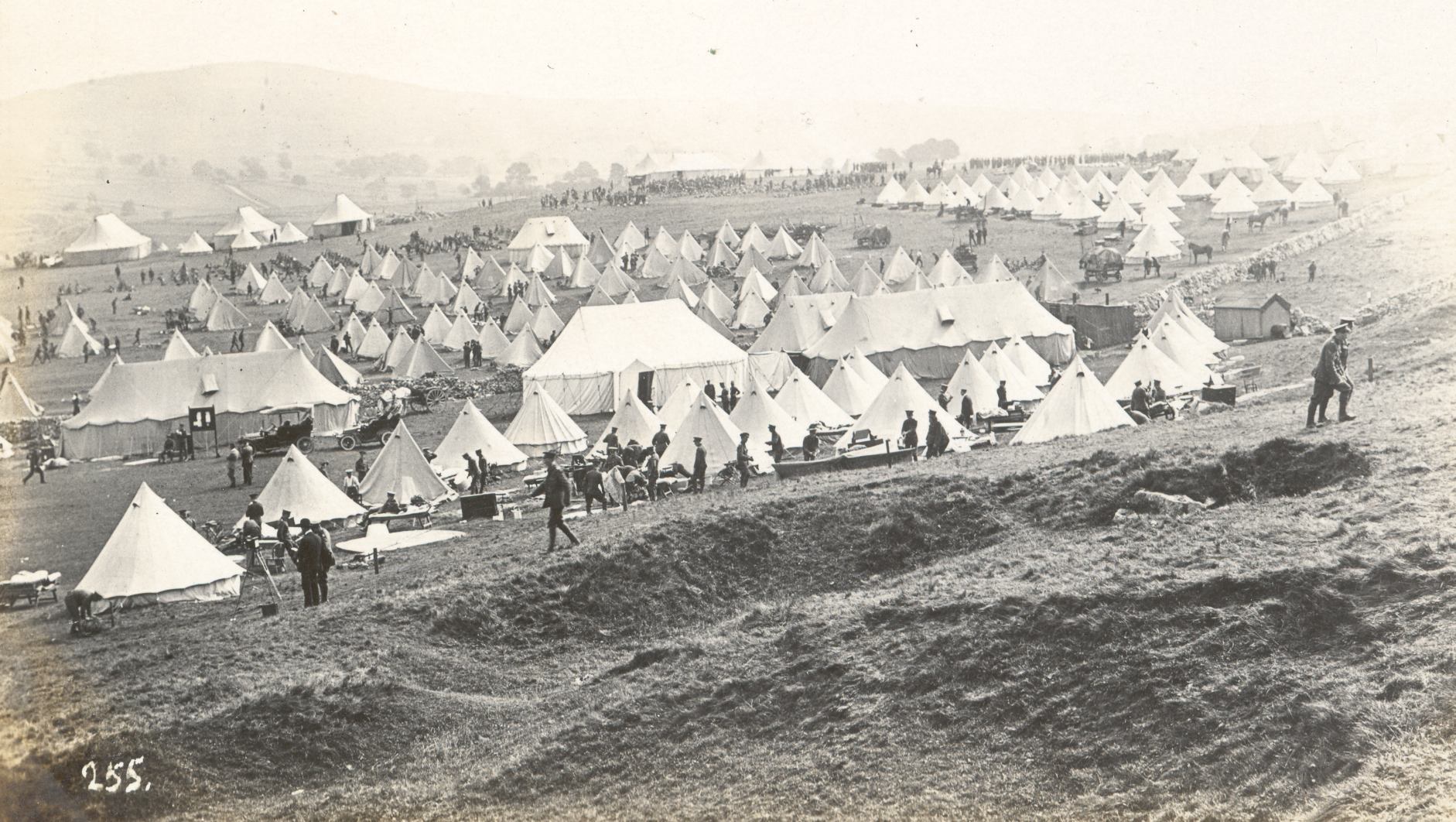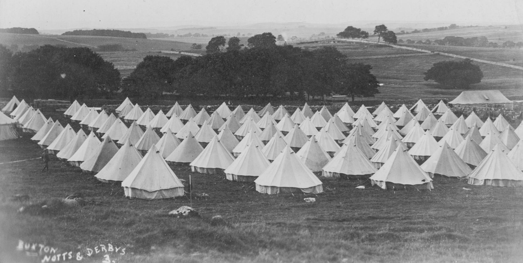The Notts and Derby Brigade at Hindlow Camp in August 1910. The Brigade comprised the 5th (Derby), 6th (Derbyshire), 7th (Nottingham) and 8th (Nottinghamshire) Battalions of the Notts and Derby (Sherwood Foresters) Regiment. The entire Brigade is assembled for a review by General Sir John French, G.C.B. on August 11th. The 5th and 6th Battalions are at the front, whilst the 7th and 8th Battalions are at the rear of the field.