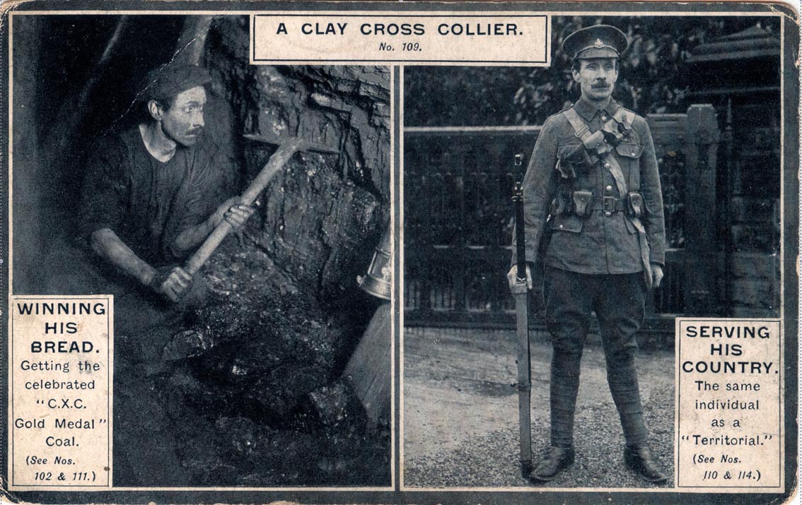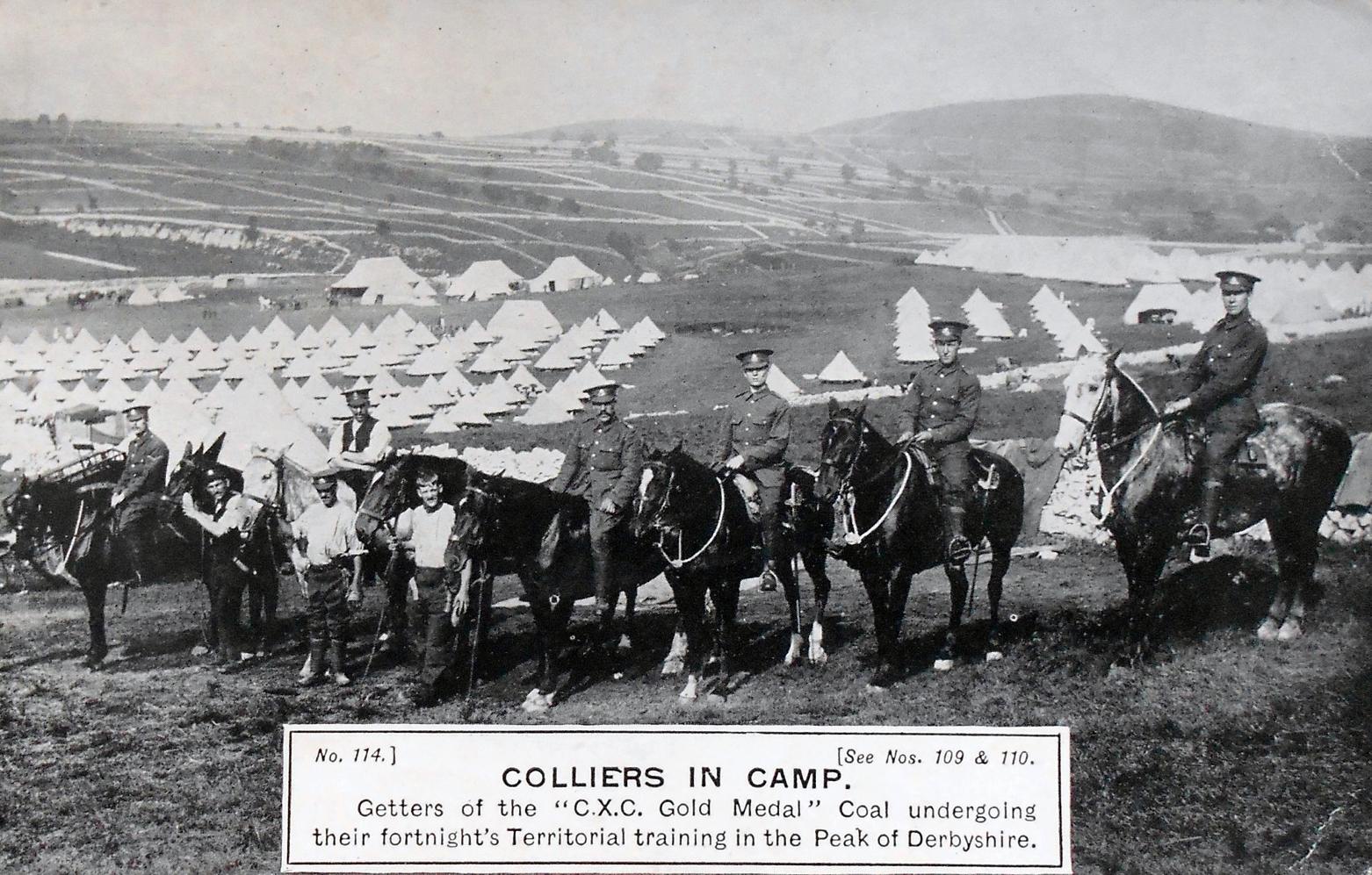 These three cards of part of a series of 25 ‘unique in character’ that depict the Clay Cross Company. In the top picture is a Clay Cross Collier “winning his bread” and “serving his country” In the middle picture our mounted men of the Battalion and probably part of the transport section and finally in bottom picture members of “G” (Clay Cross) Company are on the platform of the Midland Railway Station ready to board a train to the camping grounds near Buxton.