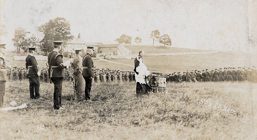 Drum Head Church Parade for the 5th and 6th Battalions. After breakfast on Sunday preparations were made for Church Parade. The Officer closest to the Chaplain is Colonel Murray, late Royal Scots, who took over command of the Notts and Derby Brigade in 1909.