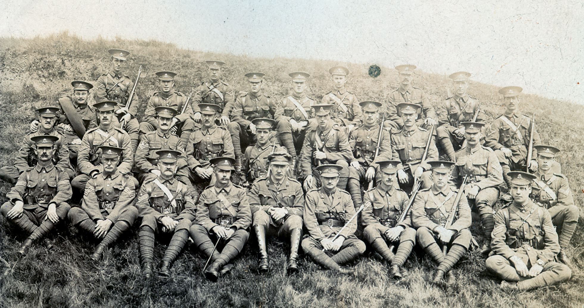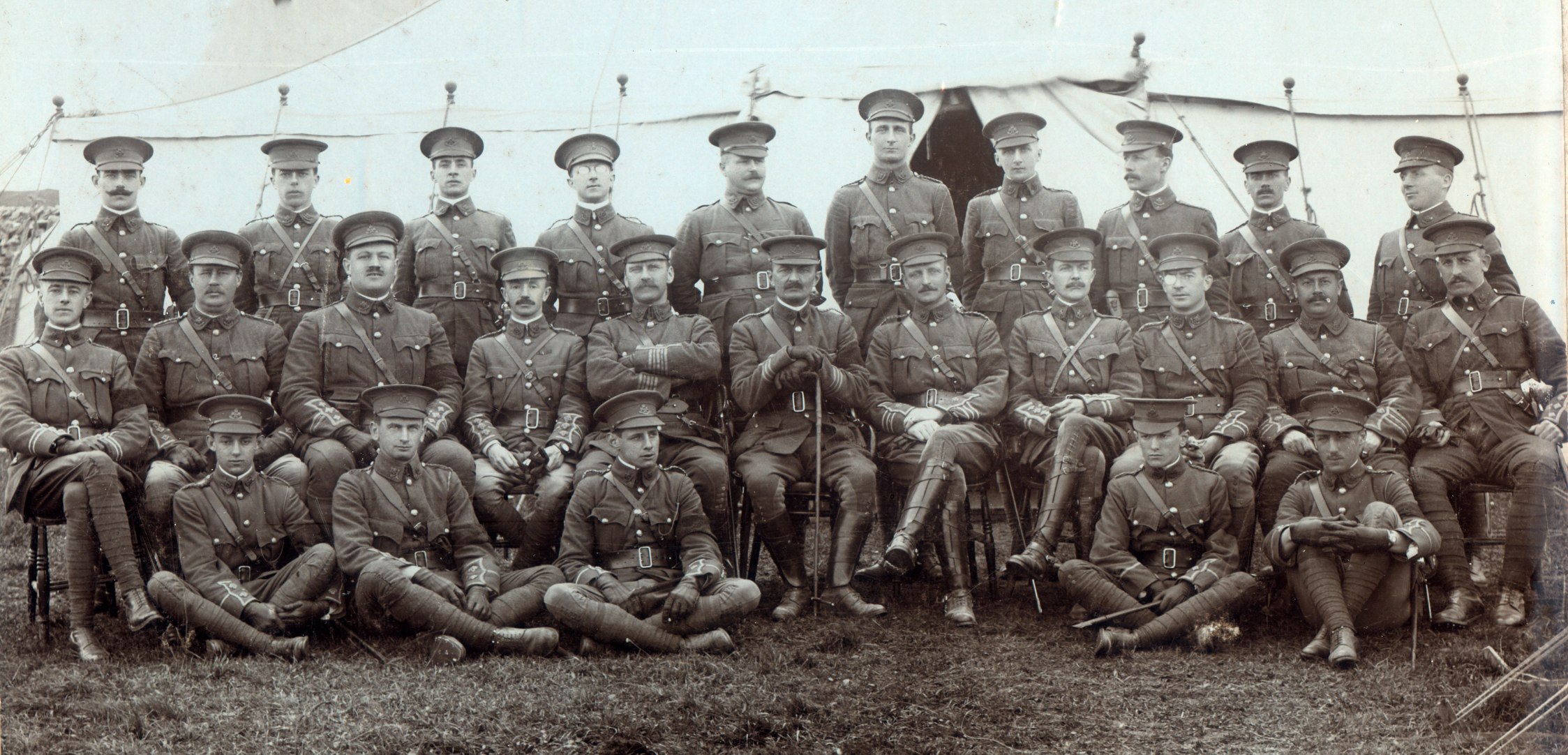 Interestingly, at least one of the men is still wearing the old Volunteer shoulder badge. The Officers are possibly Captain Newton and Lt H Rudgard who was machine gun Officer when the Battalion went to France in February 1915. Other possibilities include Lieutenants Claye or Coles.