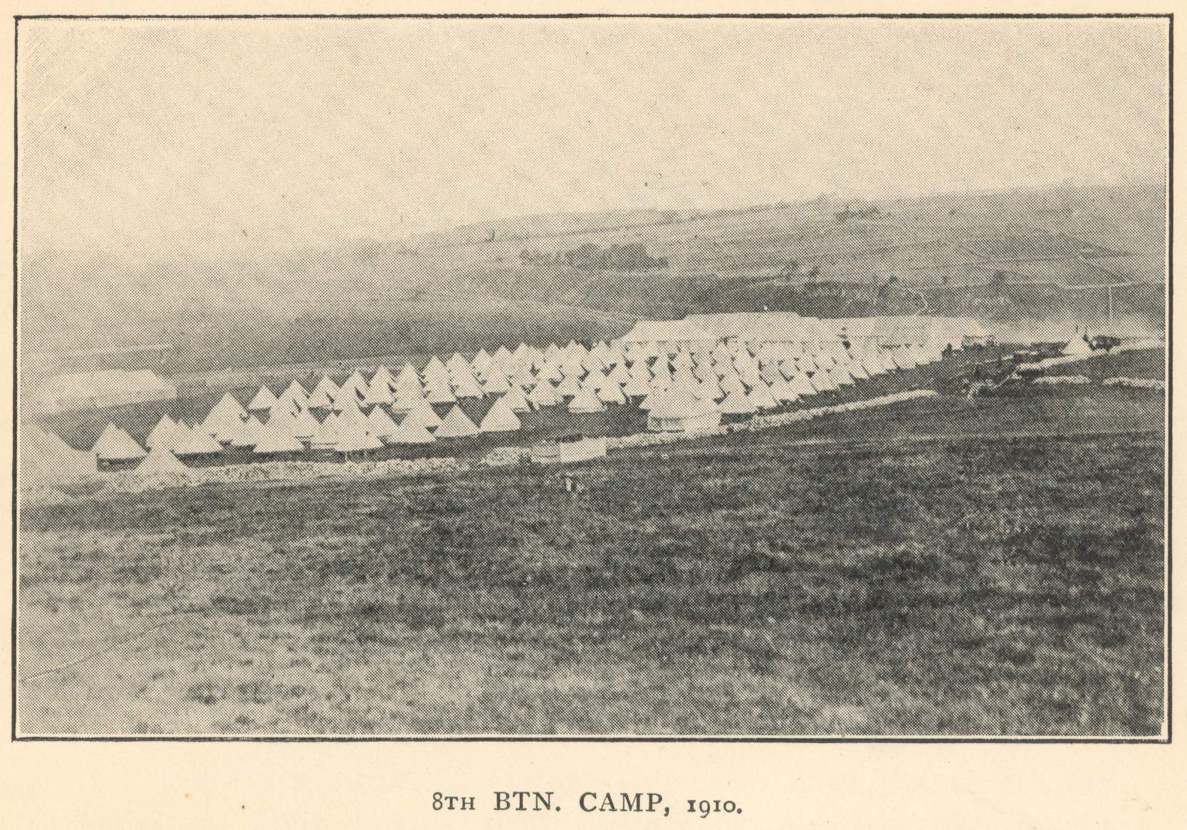 The 6th Battalion marched into Camp on the 31st July with 26 Officers, 46 Sergeants, 36 Corporals, 15 Drummers and 773 men. 127 NCOs and men returned home at the end of the first week on August 7th and 65 NCOs and men joined for the second week of camp.